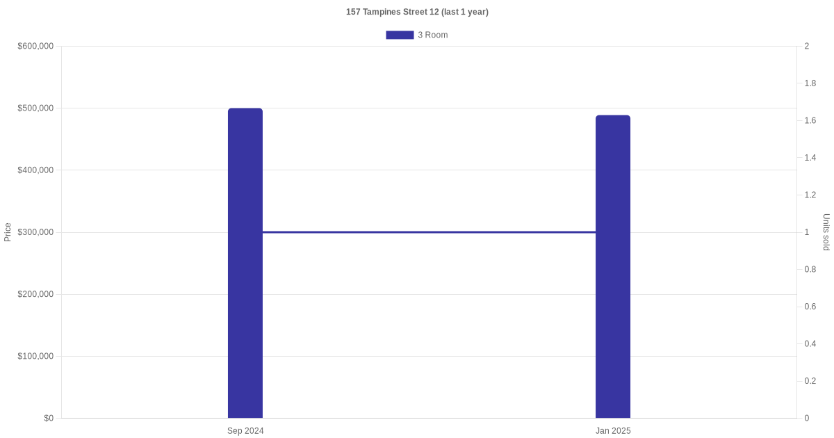 | Mar 2025 | $3,000 | 3 Room | Blk 157 Tampines Street 12 3 Room | Tampines |