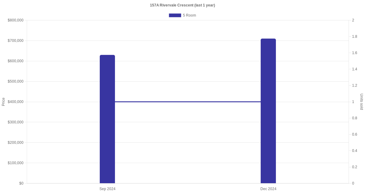 Below is a quick summary of the resale transactions volume and average price trends for the 4 room and 5 room units at 157A Rivervale Crescent.