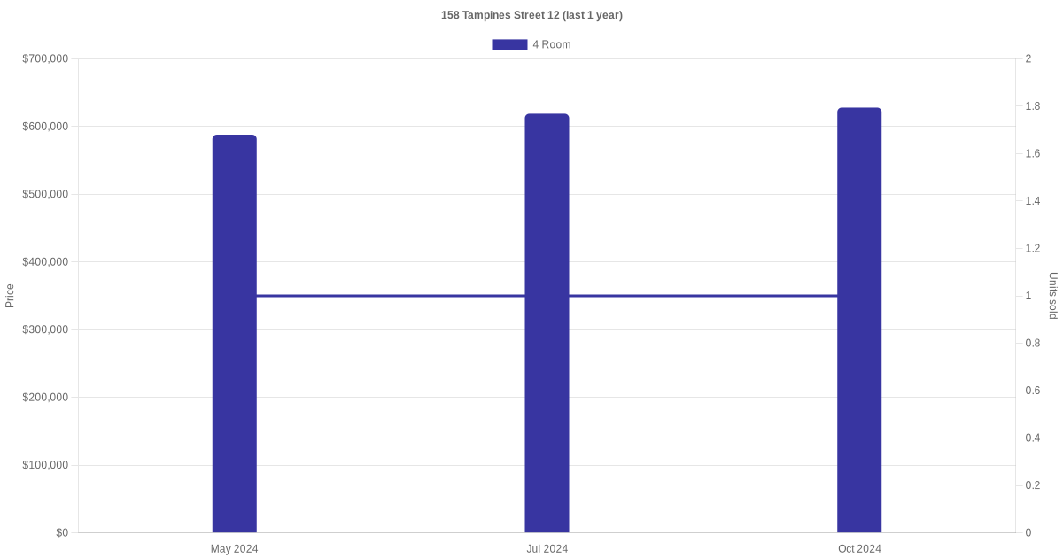 Below is a quick summary of the resale transactions volume and average price trends for the 4 room units at 158 Tampines Street 12.