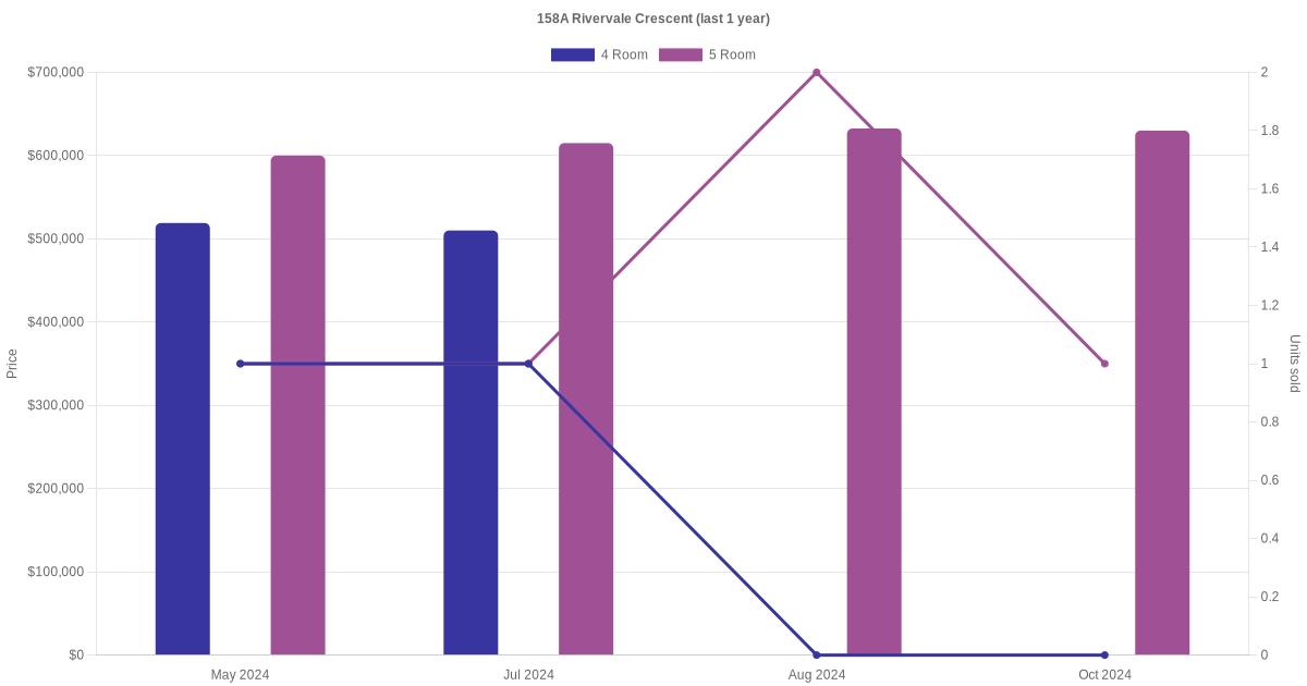 Below is a quick summary of the resale transactions volume and average price trends for the 4 room and 5 room units at 158A Rivervale Crescent.
