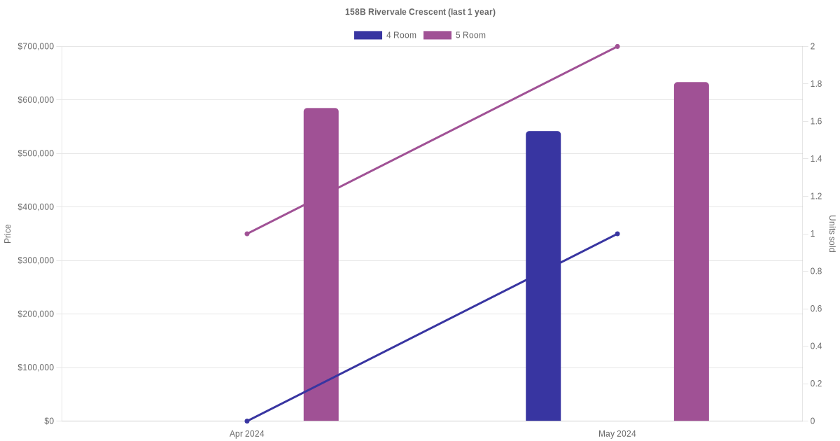 Below is a quick summary of the resale transactions volume and average price trends for the 4 room and 5 room units at 158B Rivervale Crescent.
