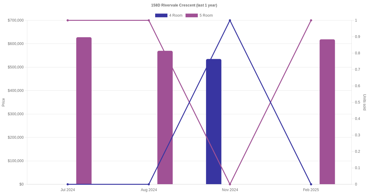 Below is a quick summary of the resale transactions volume and average price trends for the 4 room and 5 room units at 158D Rivervale Crescent.