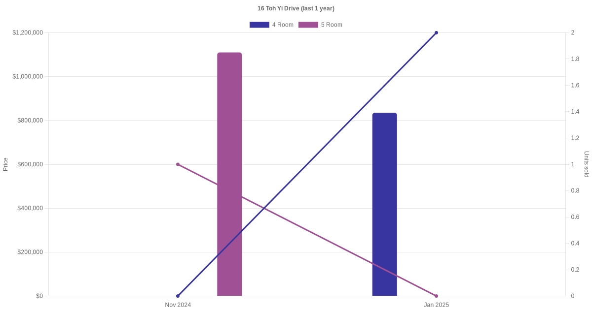 Below is a quick summary of the resale transactions volume and average price trends for the 4 room and 5 room units at 16 Toh Yi Drive.