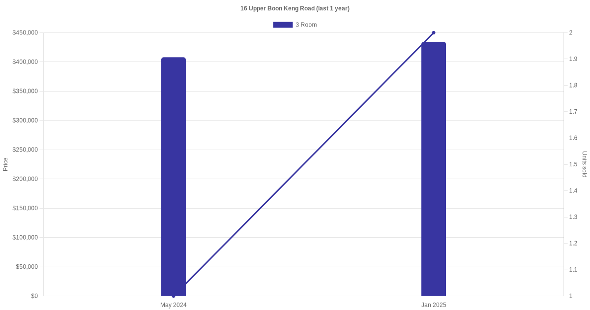 Below is a quick summary of the resale transactions volume and average price trends for the 3 room and 5 room units at 16 Upper Boon Keng Road.