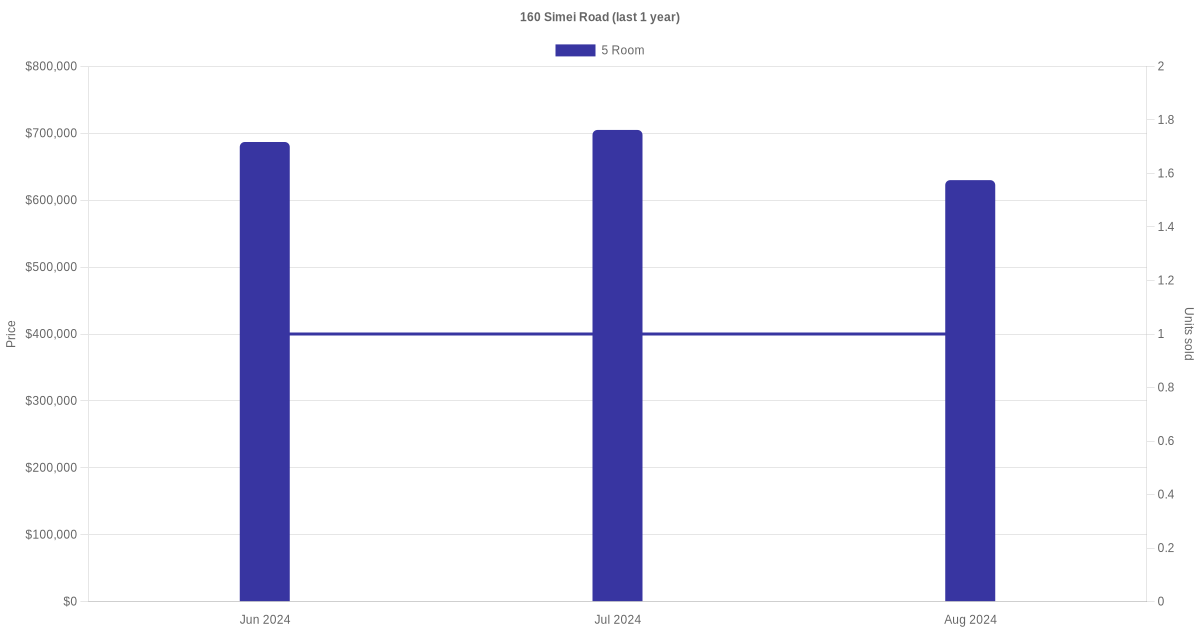 Below is a quick summary of the resale transactions volume and average price trends for the 5 room units at 160 Simei Road.