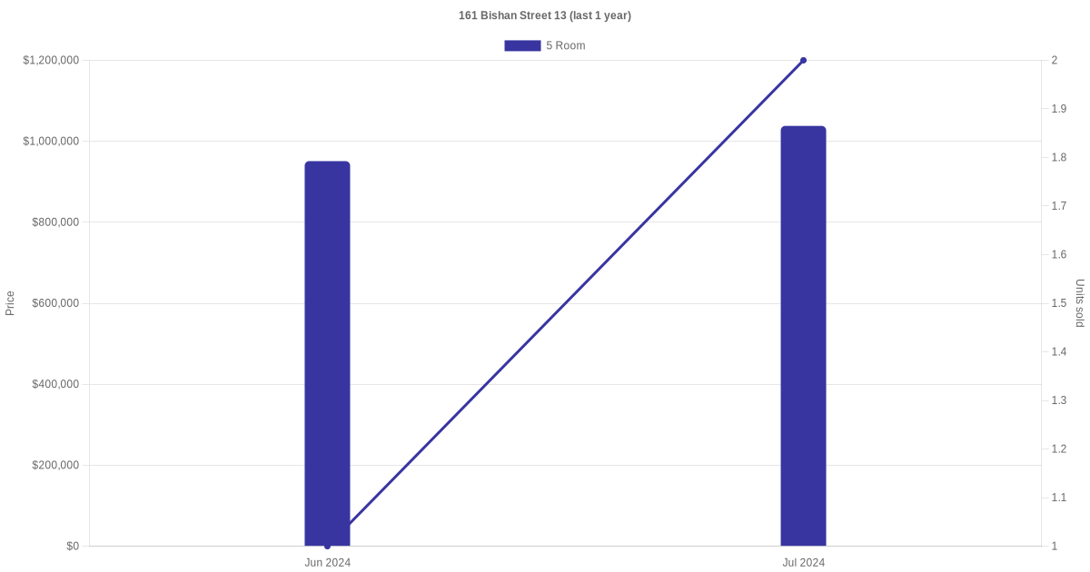 | May 2024 | $950 | 5 Room | Blk 161 Bishan Street 13 5 Room | Bishan |