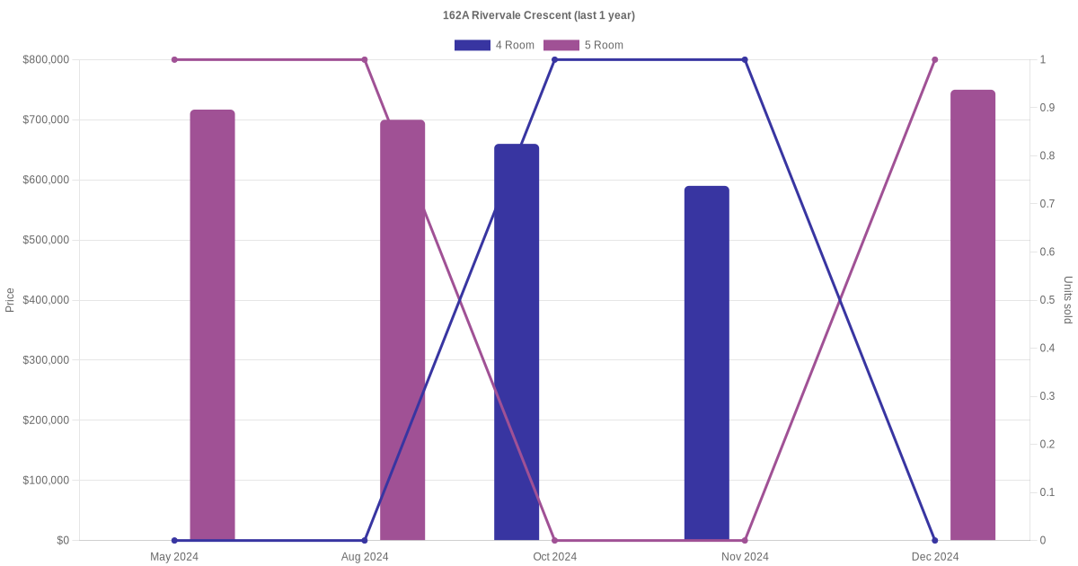 Below is a quick summary of the resale transactions volume and average price trends for the 4 room and 5 room units at 162A Rivervale Crescent.