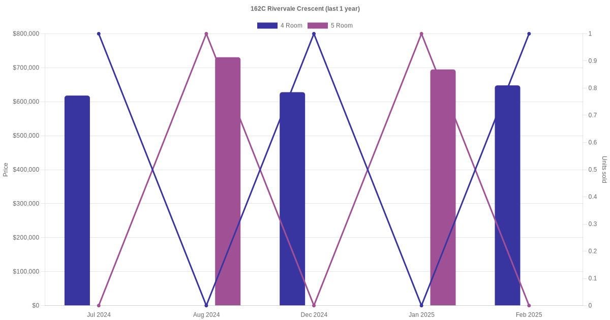 Below is a quick summary of the resale transactions volume and average price trends for the 4 room and 5 room units at 162C Rivervale Crescent.