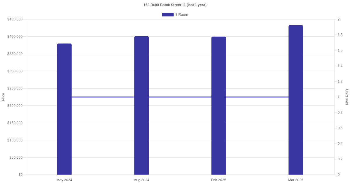 | Mar 2025 | $2,200 | 3 Room | Blk 163 Bukit Batok Street 11 3 Room | Bukit Batok |
