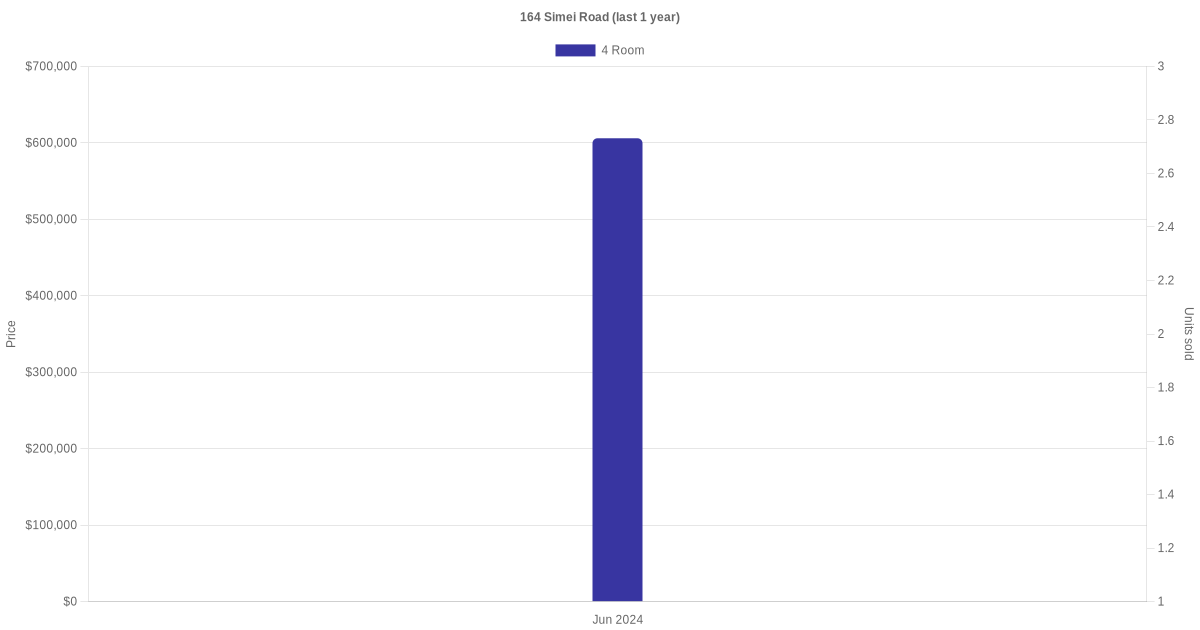 Below is a quick summary of the resale transactions volume and average price trends for the 4 room and 5 room units at 164 Simei Road.