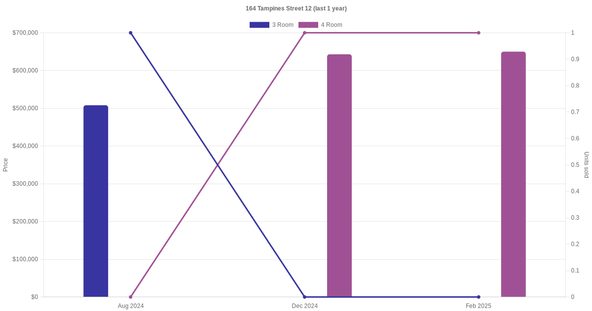 There were a total of 15 resale transactions in the last 3 years for units in block 164 Tampines Street 12, with the latest one recorded in Oct 2025.