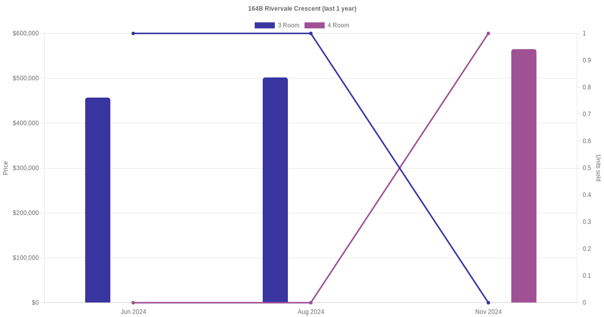 Below is a quick summary of the resale transactions volume and average price trends for the 3 room and 4 room units at 164B Rivervale Crescent.