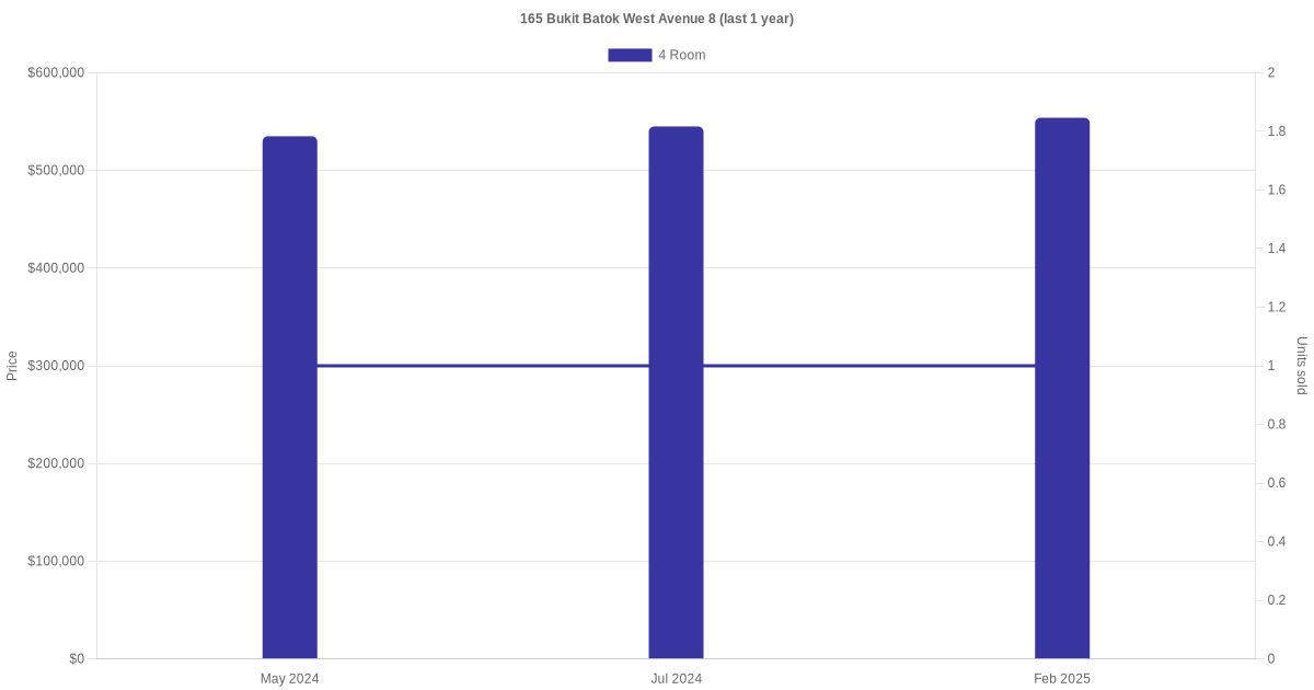 Below is a quick summary of the resale transactions volume and average price trends for the 4 room units at 165 Bukit Batok West Avenue 8.