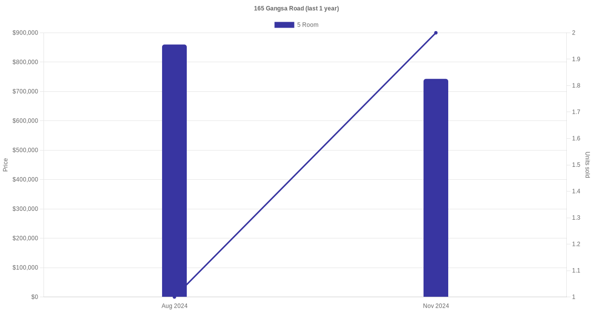 Below is a quick summary of the resale transactions volume and average price trends for the 4 room and 5 room units at 165 Gangsa Road.