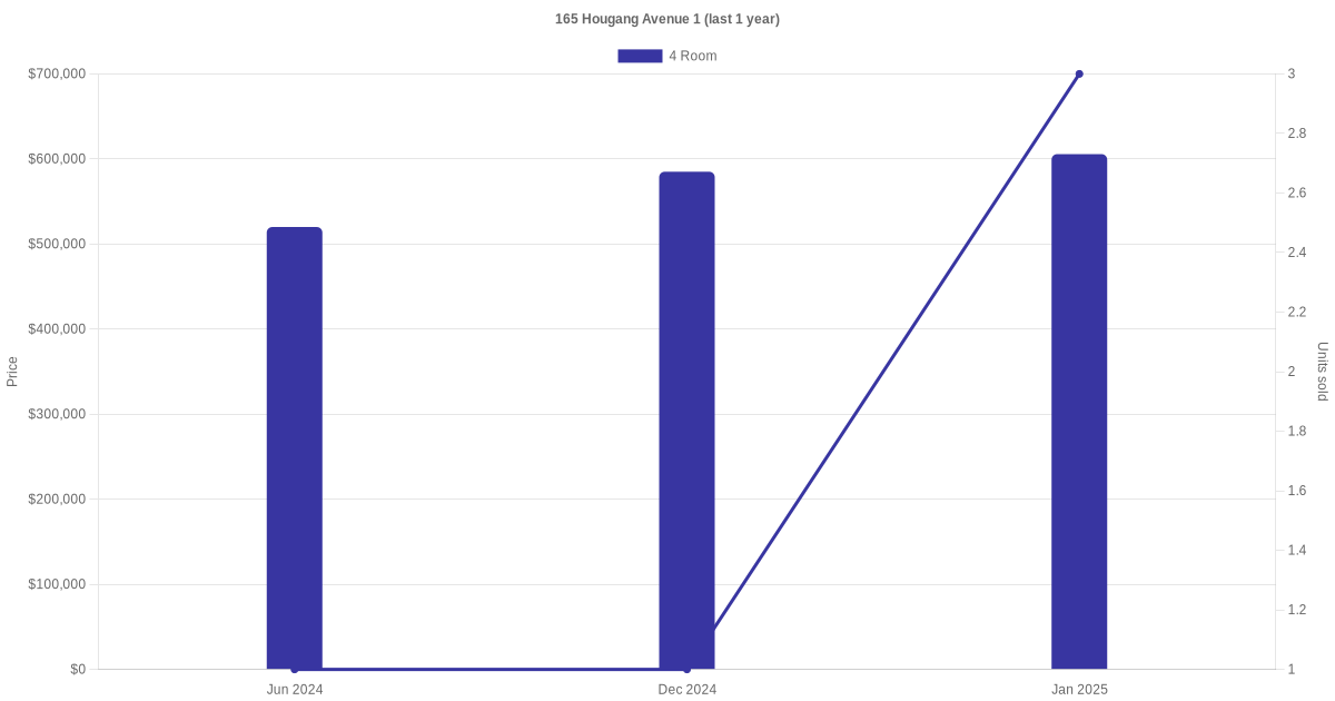 Below is a quick summary of the resale transactions volume and average price trends for the 4 room units at 165 Hougang Avenue 1.