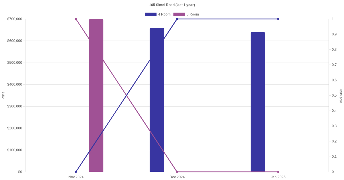 Below is a quick summary of the resale transactions volume and average price trends for the 4 room and 5 room units at 165 Simei Road.
