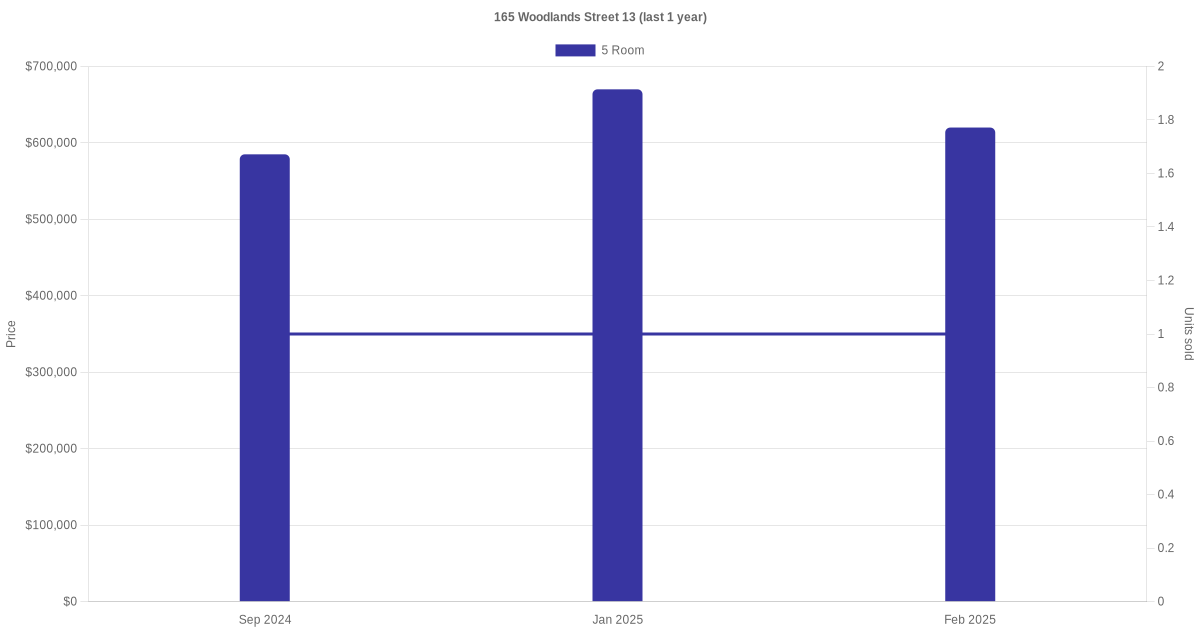 Below is a quick summary of the resale transactions volume and average price trends for the 4 room and 5 room units at 165 Woodlands Street 13.