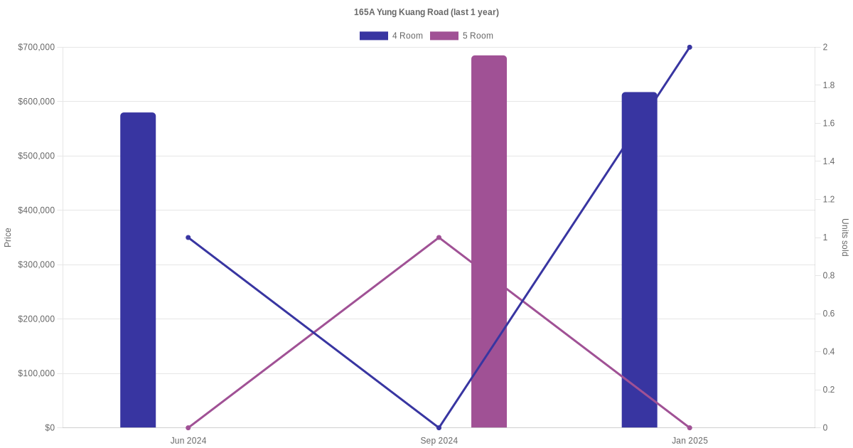 Below is a quick summary of the resale transactions volume and average price trends for the 4 room and 5 room units at 165A Yung Kuang Road.