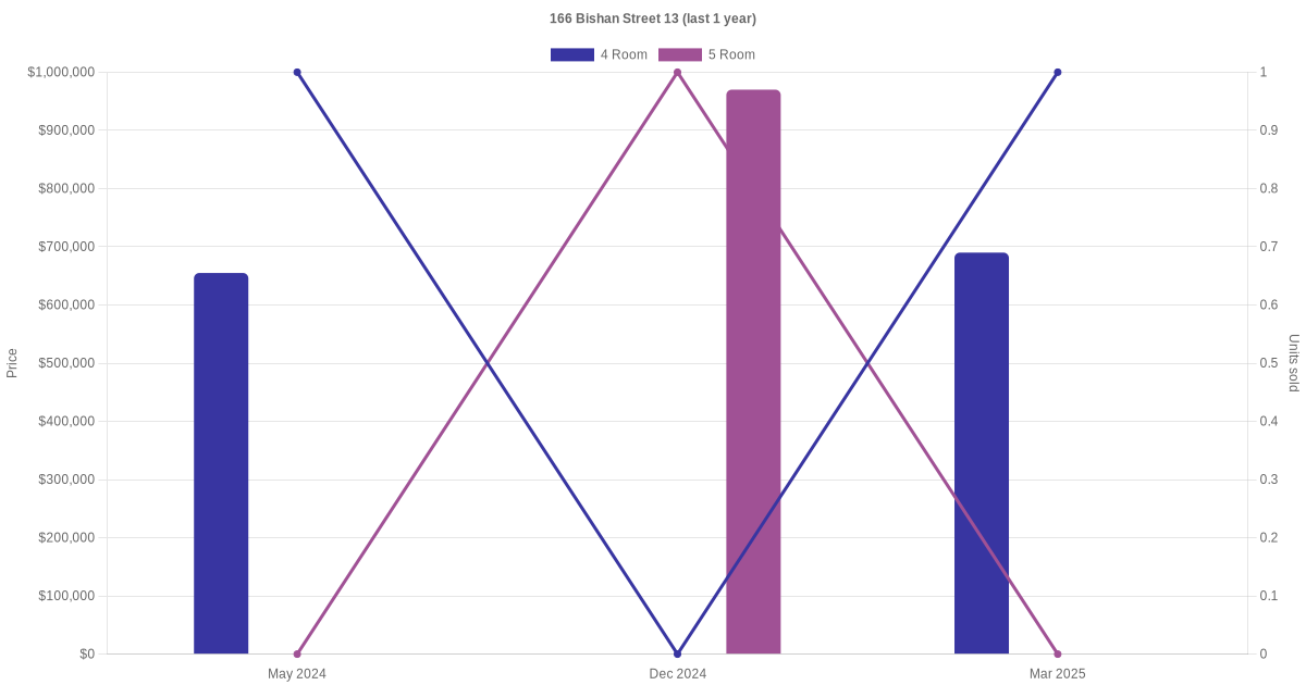 Below is a quick summary of the resale transactions volume and average price trends for the 4 room and 5 room units at 166 Bishan Street 13.