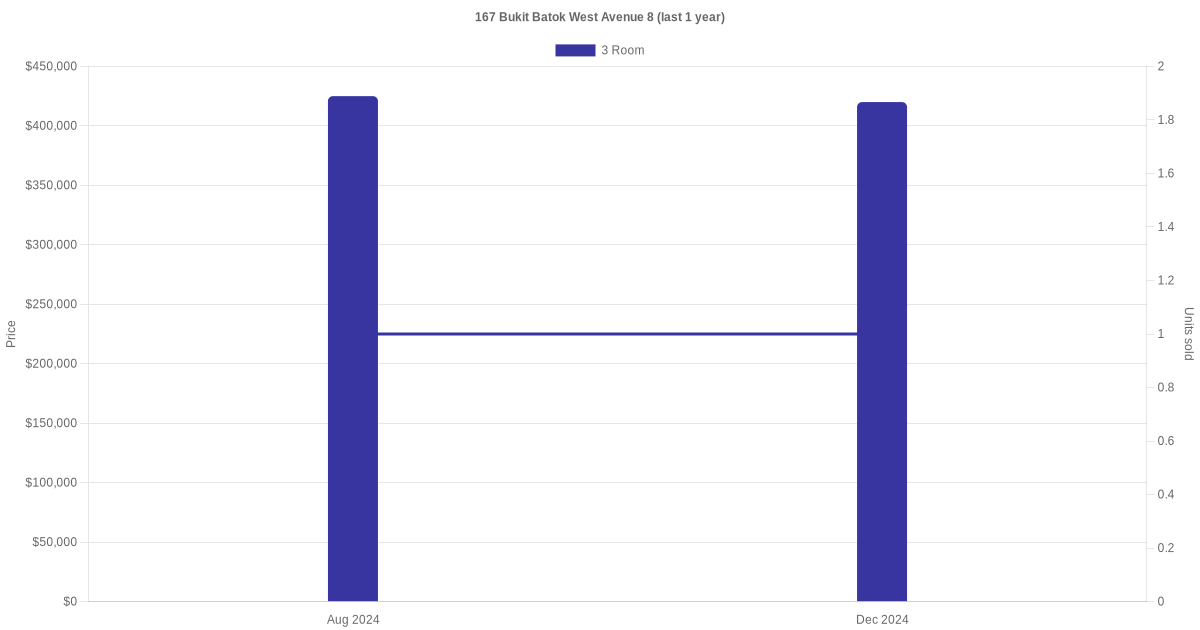 Below is a quick summary of the resale transactions volume and average price trends for the 3 room units at 167 Bukit Batok West Avenue 8.
