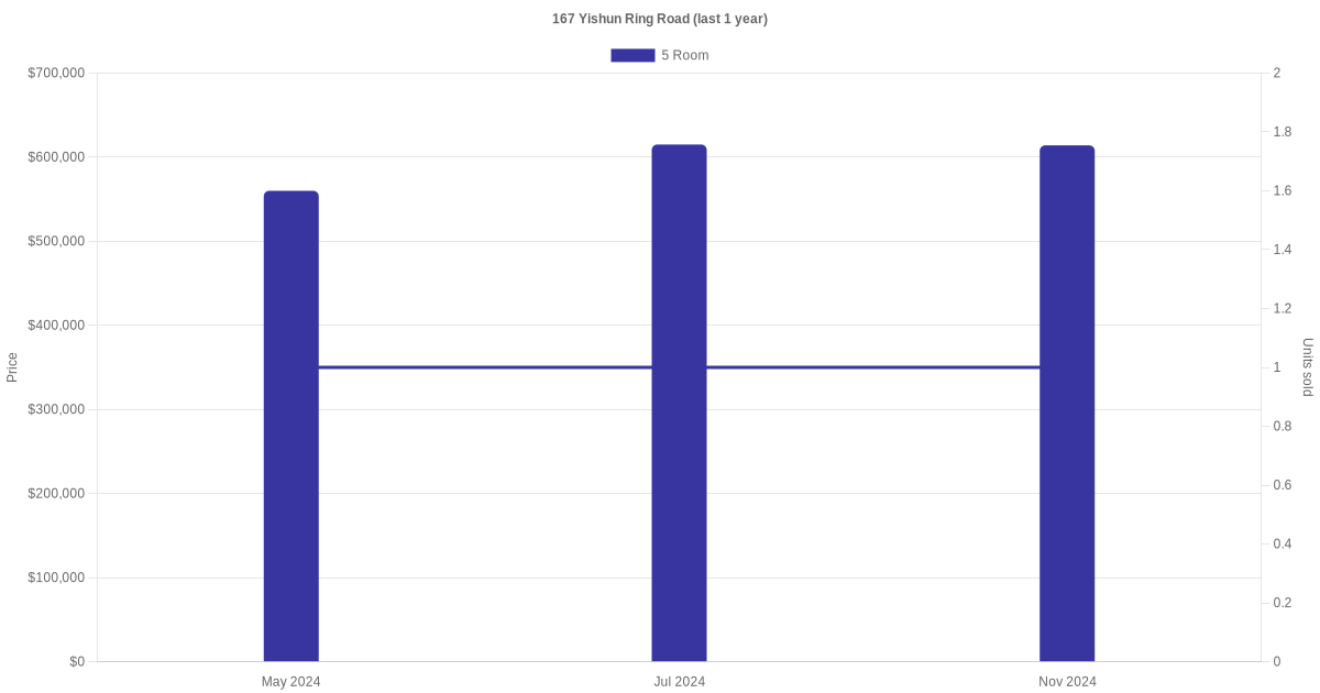 | Jul 2024 | $615,000 | $5,083 | 5 Room | Blk 167 Yishun Ring Road 5 Room / 121 sqm | 07 to 09 | 121 sqm | Improved | 1987 |