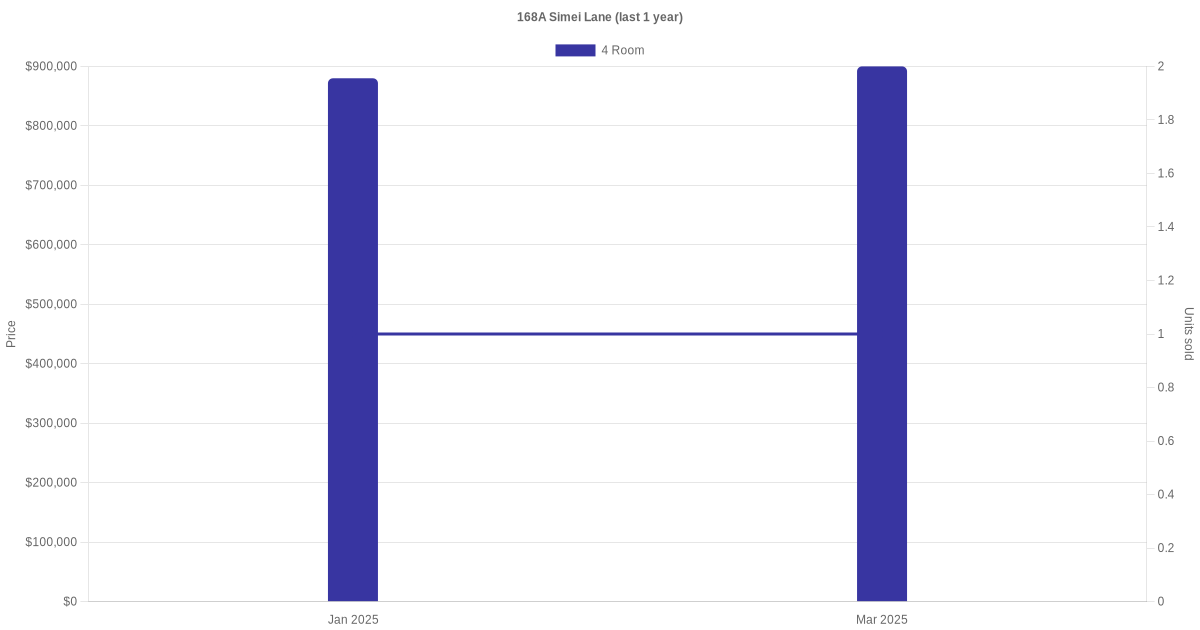 Below is a quick summary of the resale transactions volume and average price trends for the 4 room and 5 room units at 168A Simei Lane.