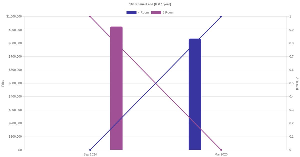 Below is a quick summary of the resale transactions volume and average price trends for the 4 room and 5 room units at 168B Simei Lane.