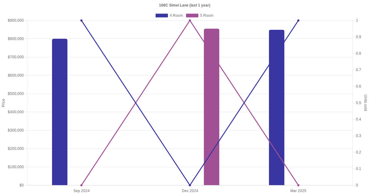 Below is a quick summary of the resale transactions volume and average price trends for the 4 room and 5 room units at 168C Simei Lane.