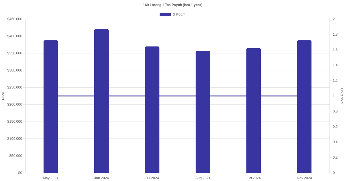 Below is a quick summary of the resale transactions volume and average price trends for the 3 room units at 169 Lorong 1 Toa Payoh.