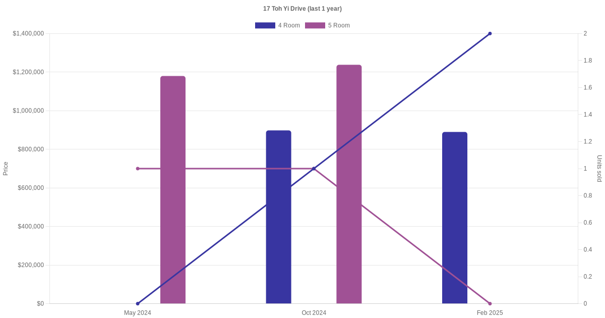 Below is a quick summary of the resale transactions volume and average price trends for the 4 room and 5 room units at 17 Toh Yi Drive.
