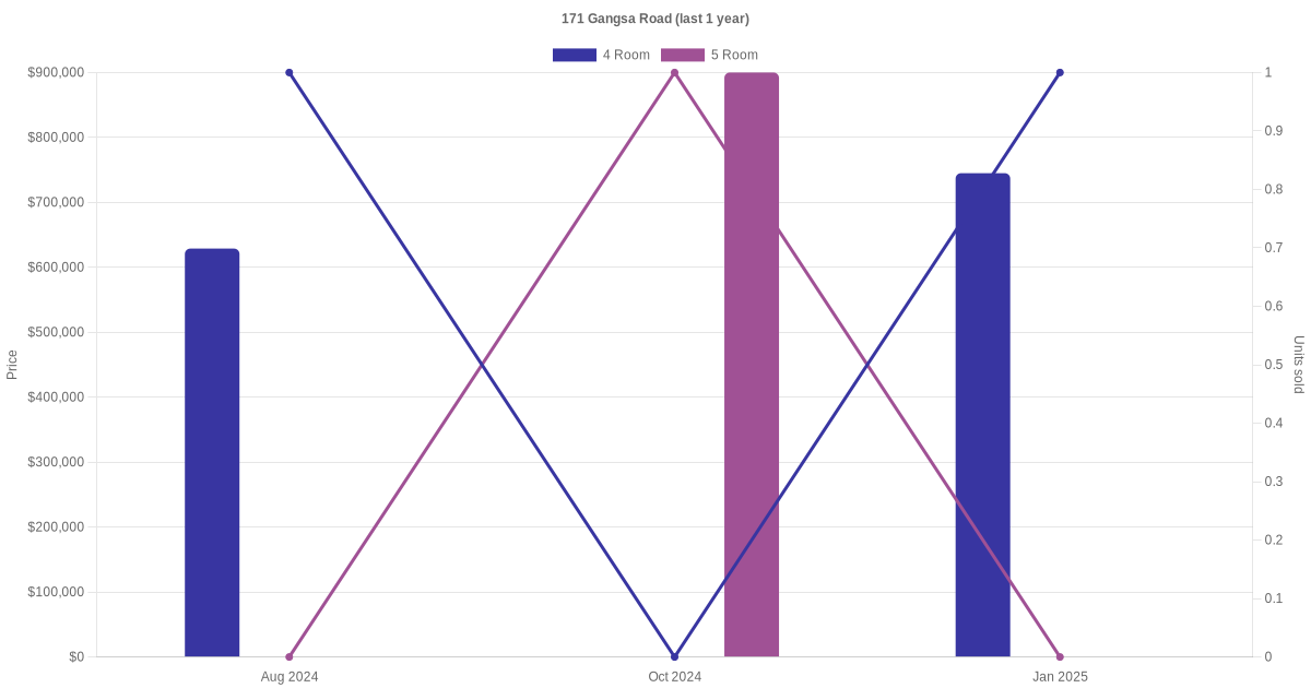 Below is a quick summary of the resale transactions volume and average price trends for the 4 room and 5 room units at 171 Gangsa Road.