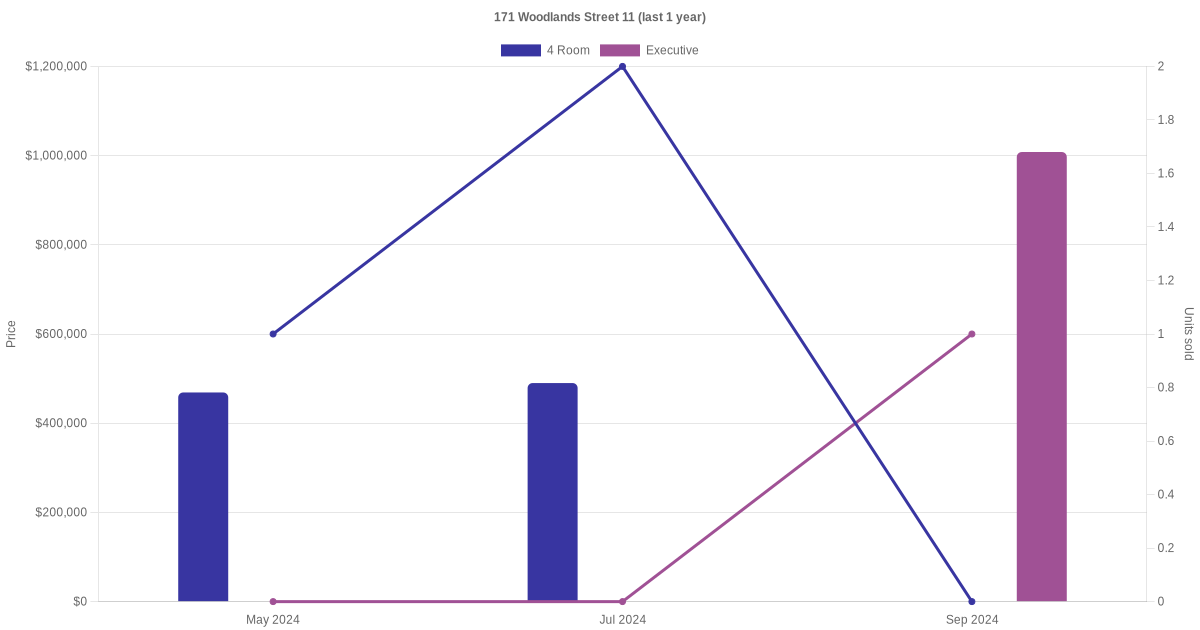 Below is a quick summary of the resale transactions volume and average price trends for the 4 room and executive units at 171 Woodlands Street 11.