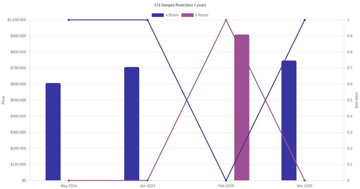 Below is a quick summary of the resale transactions volume and average price trends for the 4 room and 5 room units at 172 Gangsa Road.