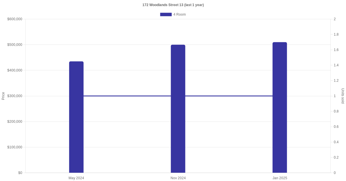 Below is a quick summary of the resale transactions volume and average price trends for the 4 room units at 172 Woodlands Street 13.
