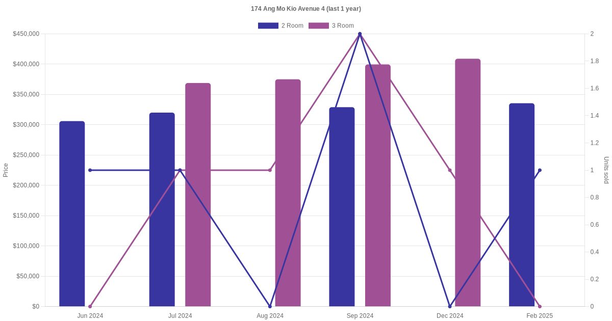 Below is a quick summary of the resale transactions volume and average price trends for the 2 room and 3 room units at 174 Ang Mo Kio Avenue 4.