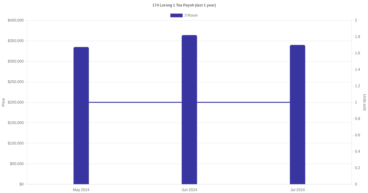 Below is a quick summary of the resale transactions volume and average price trends for the 3 room units at 174 Lorong 1 Toa Payoh.