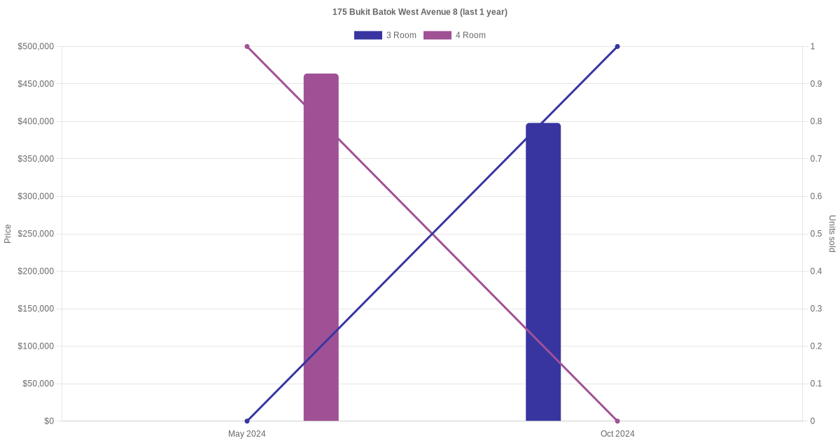 Below is a quick summary of the resale transactions volume and average price trends for the 3 room and 4 room units at 175 Bukit Batok West Avenue 8.