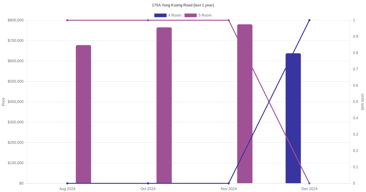 Below is a quick summary of the resale transactions volume and average price trends for the 4 room and 5 room units at 175A Yung Kuang Road.