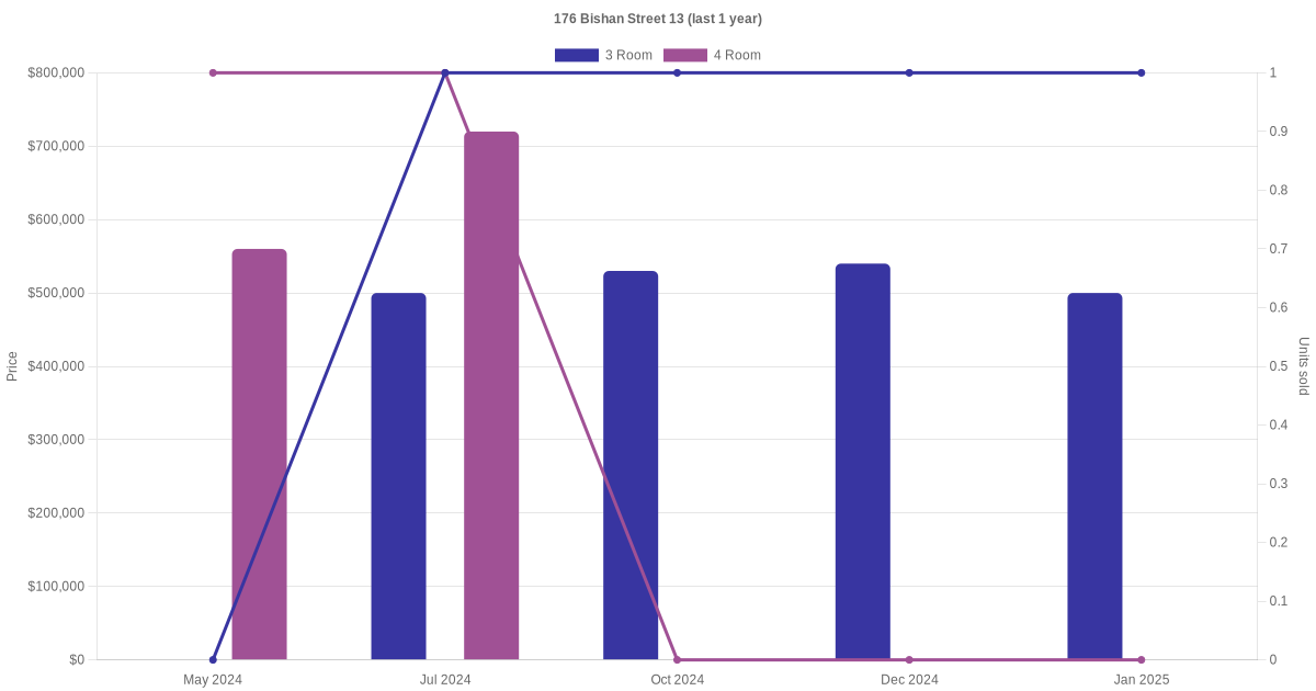 Below is a quick summary of the resale transactions volume and average price trends for the 3 room and 4 room units at 176 Bishan Street 13.