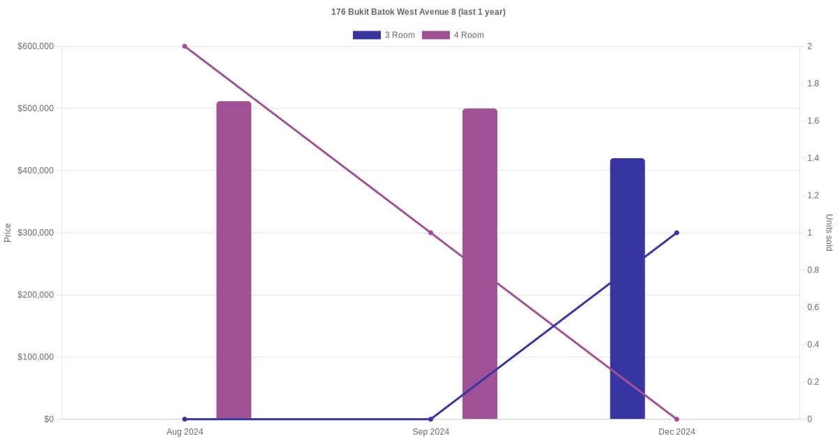 Below is a quick summary of the resale transactions volume and average price trends for the 3 room and 4 room units at 176 Bukit Batok West Avenue 8.