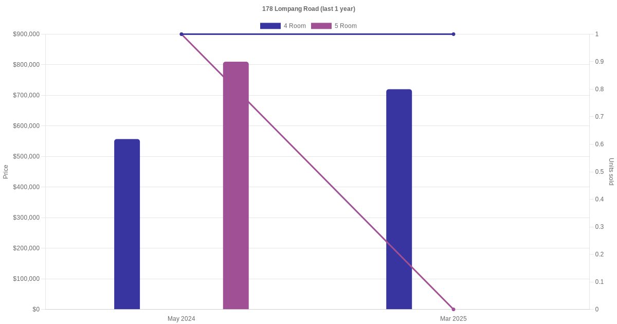 Below is a quick summary of the resale transactions volume and average price trends for the 4 room and 5 room units at 178 Lompang Road.