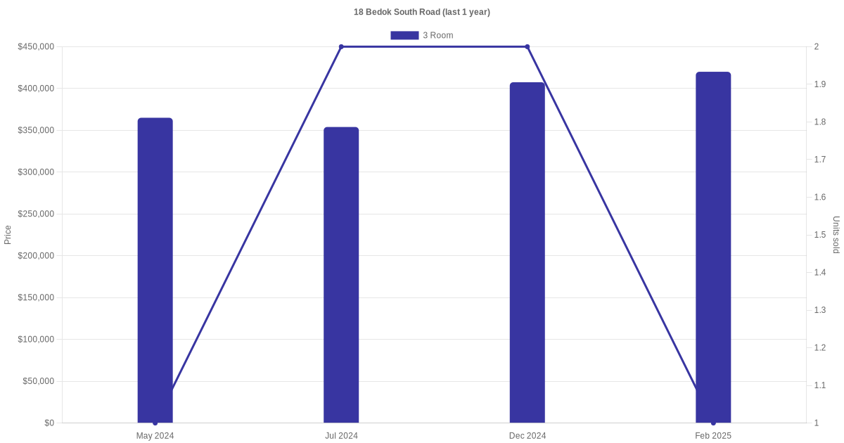 Below is a quick summary of the resale transactions volume and average price trends for the 3 room units at 18 Bedok South Road.