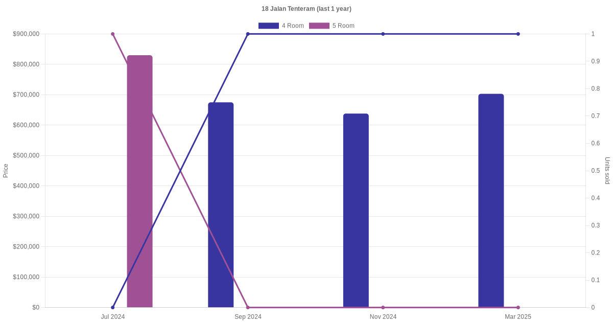 Below is a quick summary of the resale transactions volume and average price trends for the 4 room and 5 room units at 18 Jalan Tenteram.