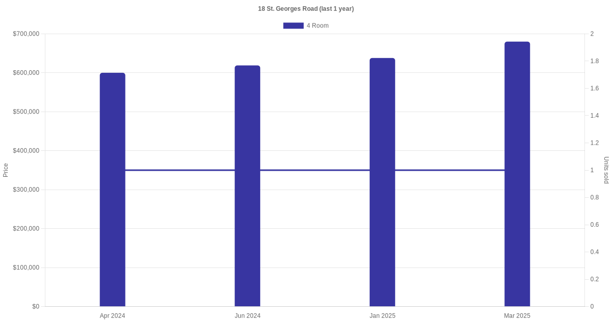 Below is a quick summary of the resale transactions volume and average price trends for the 4 room units at 18 St. George's Road.