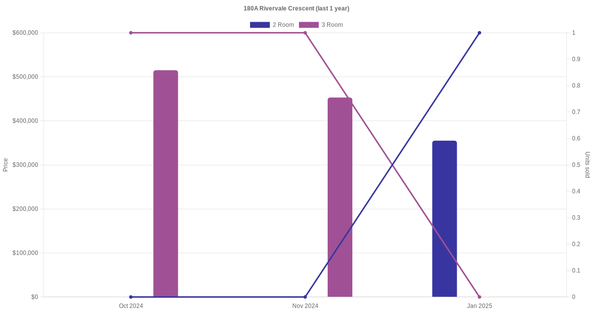 Below is a quick summary of the resale transactions volume and average price trends for the 2 room and 3 room units at 180A Rivervale Crescent.