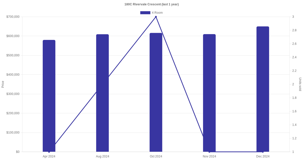 Below is a quick summary of the resale transactions volume and average price trends for the 4 room units at 180C Rivervale Crescent.
