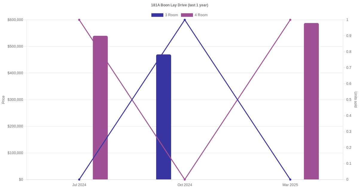 Below is a quick summary of the resale transactions volume and average price trends for the 3 room and 4 room units at 181A Boon Lay Drive.