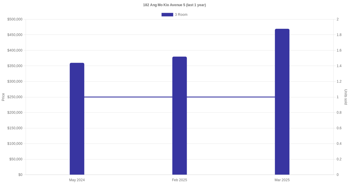 | May 2025 | $1,800 | 3 Room | Blk 182 Ang Mo Kio Avenue 5 3 Room | Ang Mo Kio |