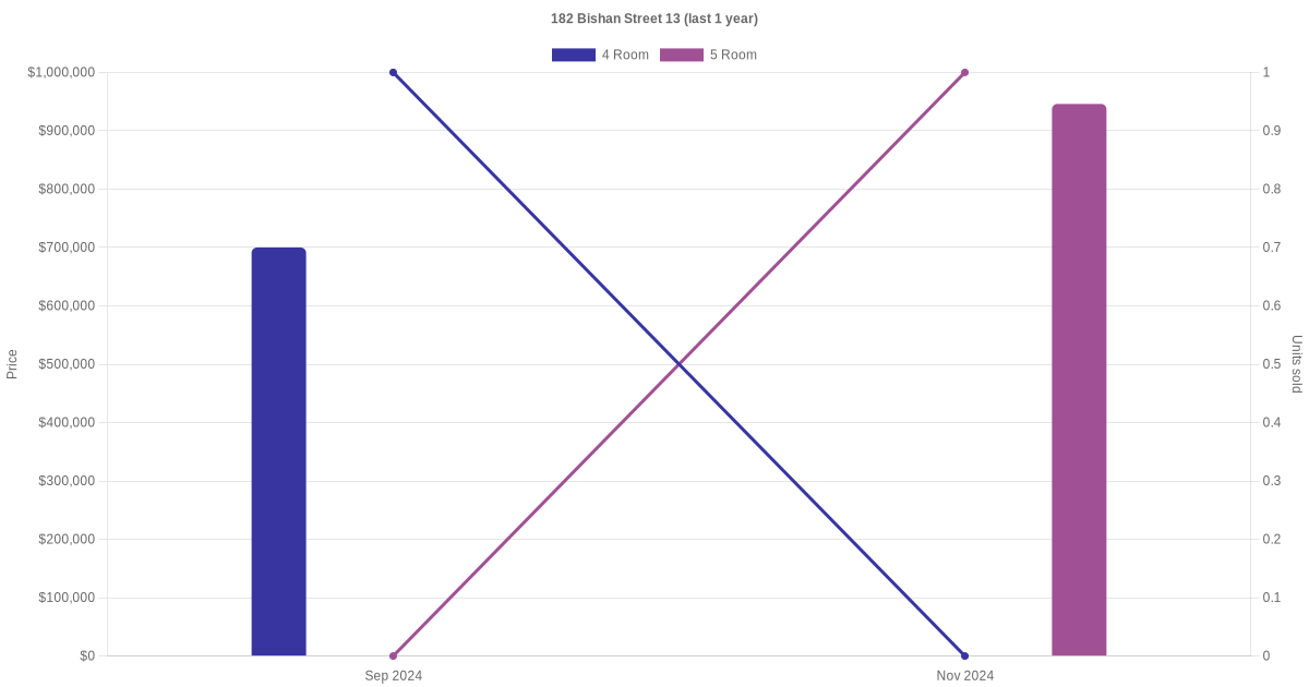 Below is a quick summary of the resale transactions volume and average price trends for the 4 room and 5 room units at 182 Bishan Street 13.