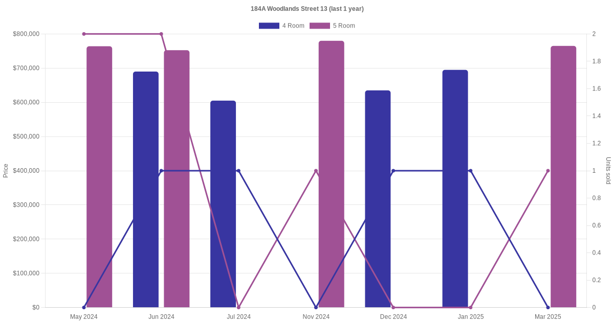 Below is a quick summary of the resale transactions volume and average price trends for the 4 room and 5 room units at 184A Woodlands Street 13.